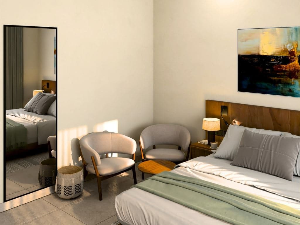 - Deluxe Sea View — 38 кв. м, в номере с видом на море двуспальная кровать или две односпальные кровати и диван. Число гостей — до 3 человек