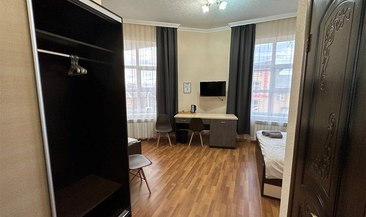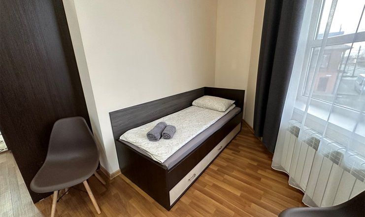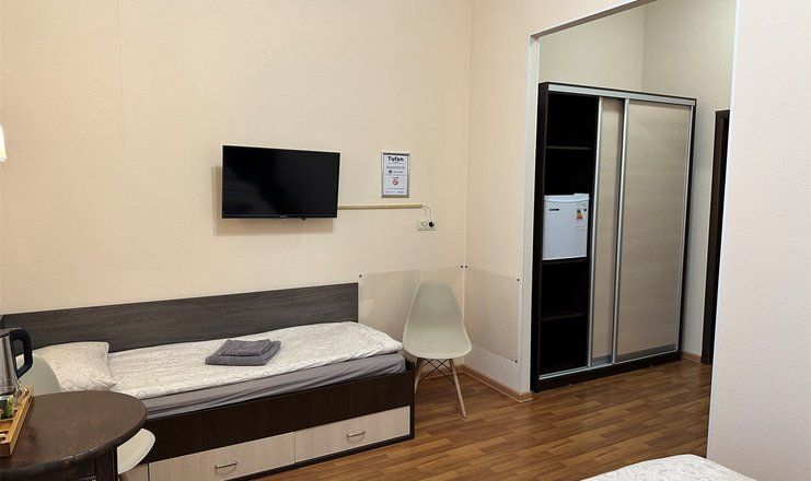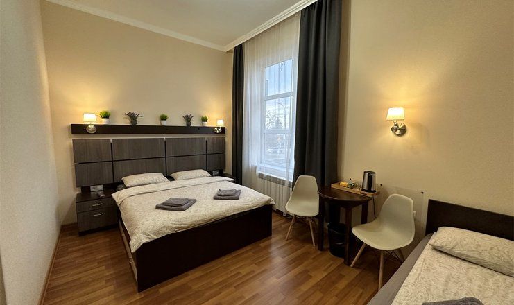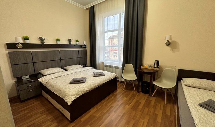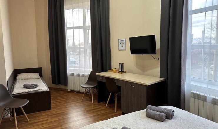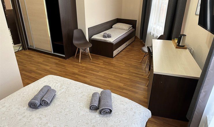 Трехместный номер с душевой комнатой, санузлом и телевизором, в номере одна большая двуспальная кровать и одна односпальная кровать, кондиционер, холодильник, чайник, полотенца, мыло, шампунь, Wi-Fi, 20 кв м