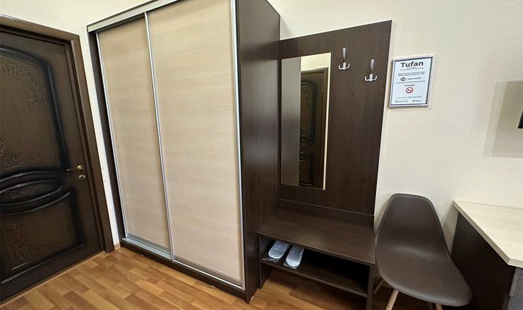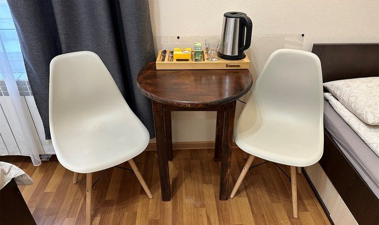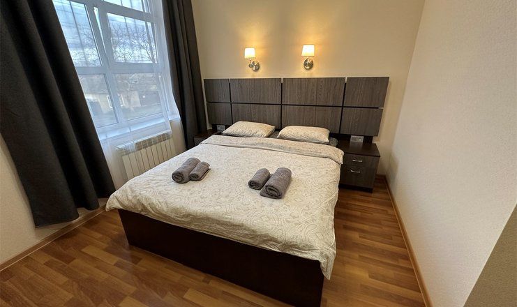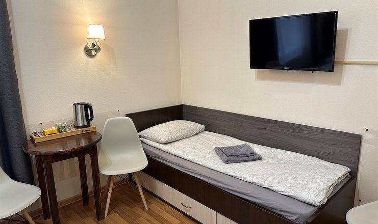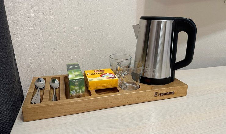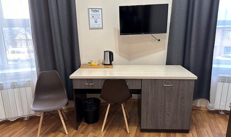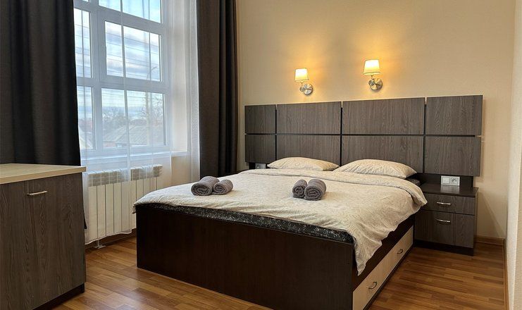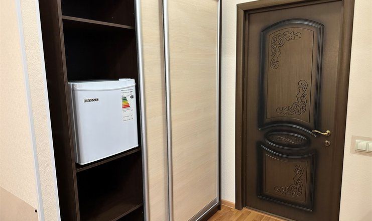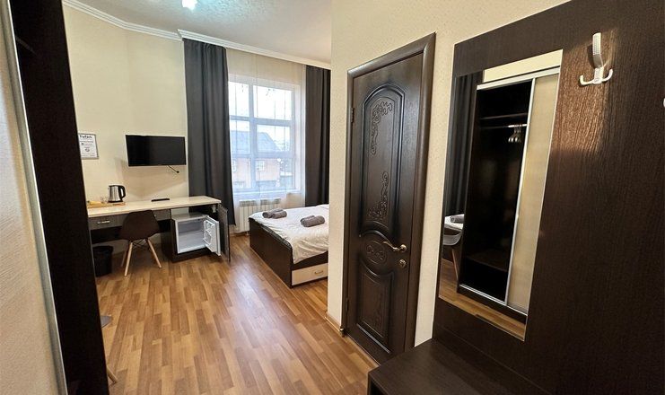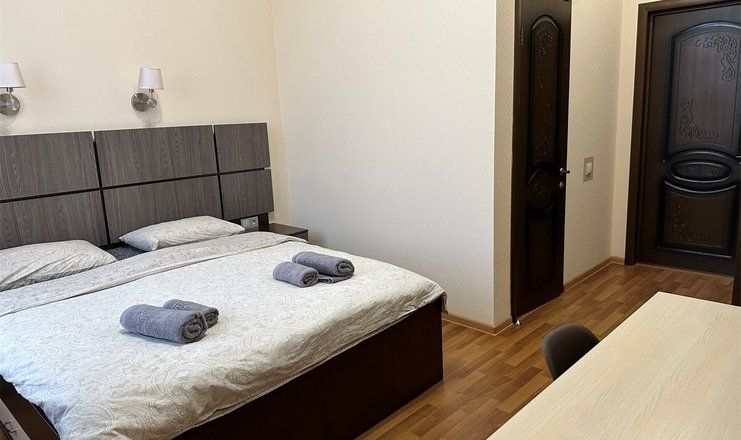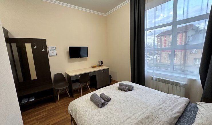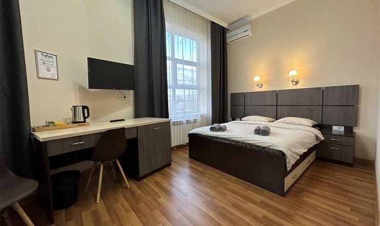 Двухместный номер с душевой комнатой, санузлом и телевизором, в номере большая двуспальная кровать, кондиционер, холодильник, чайник, полотенца, мыло, шампунь, Wi-Fi, 20 кв м
