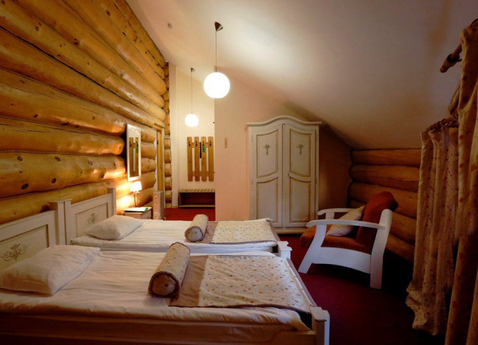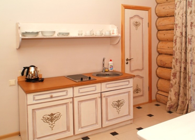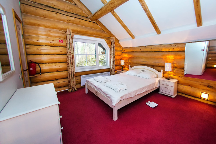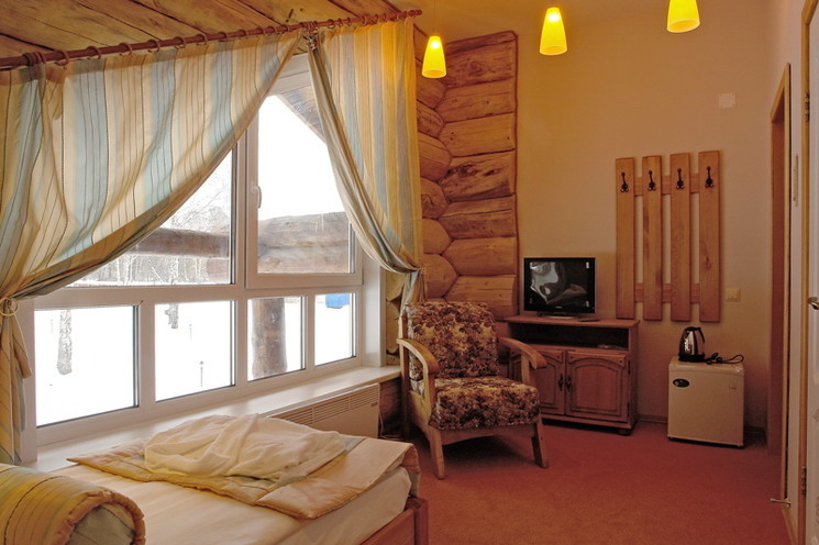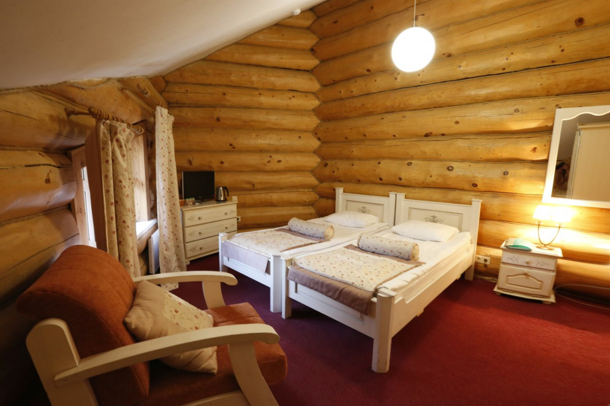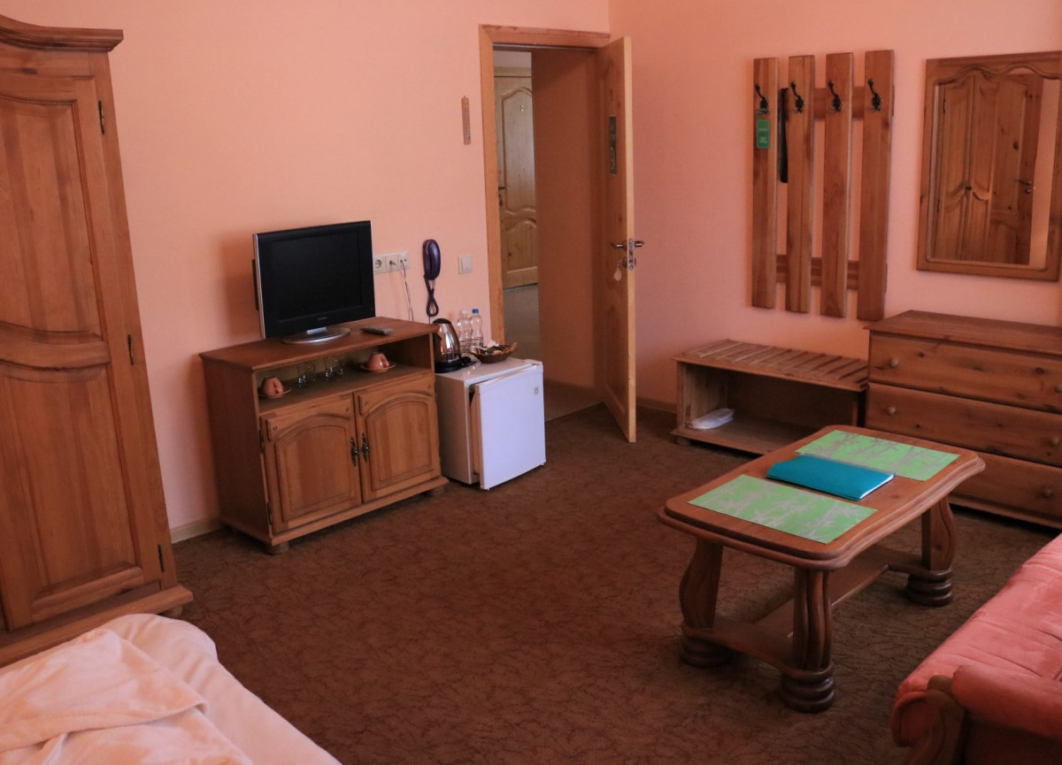 - люкс 1 (Коттедж Чуя) — 40 кв. м., 2 односпальные кровати, 2 дополнительных спальных места (диван). Гостиная с кухонной зоной, спальня.