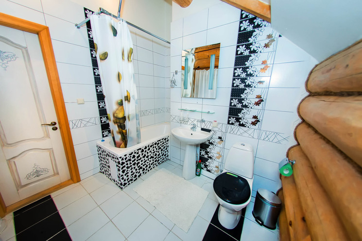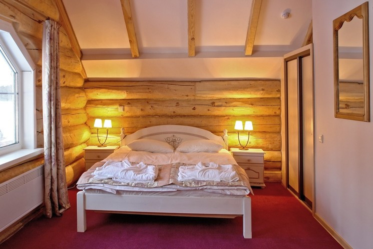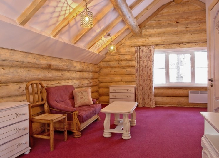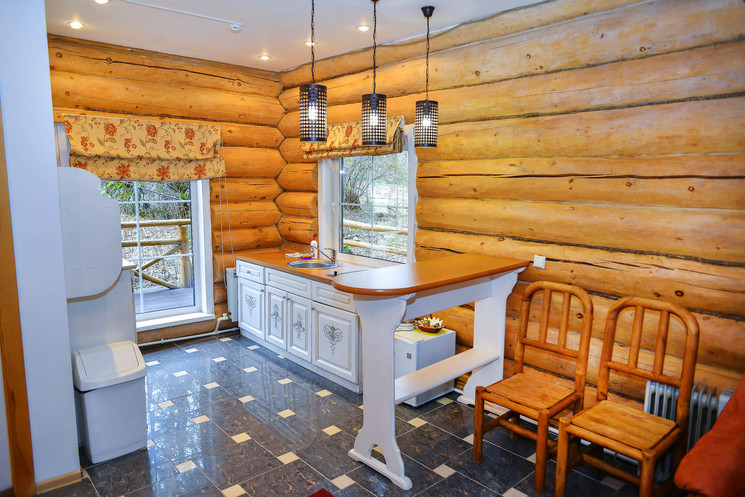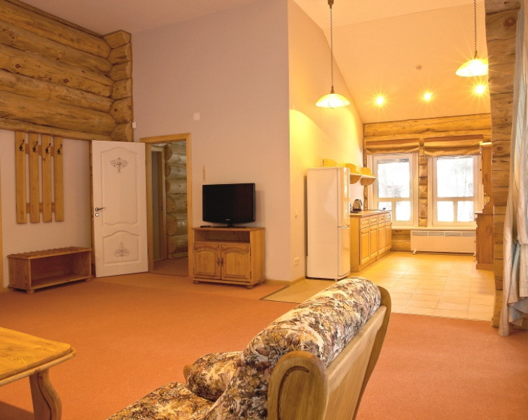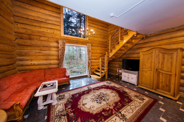 - коттедж Золотой Корень — 63 кв. м., 1 двуспальная кровать, 1 дополнительное спальное место (диван). Гостиная с кухонной зоной, спальня.