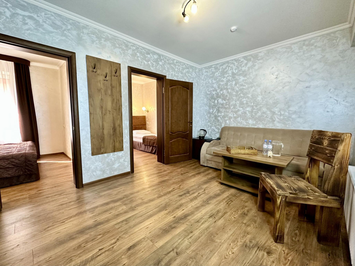 - Люкс 3-комнатный — 33 кв. м, спальня с двуспальной кроватью, спальня с двумя односпальными кроватями и гостиная с диваном