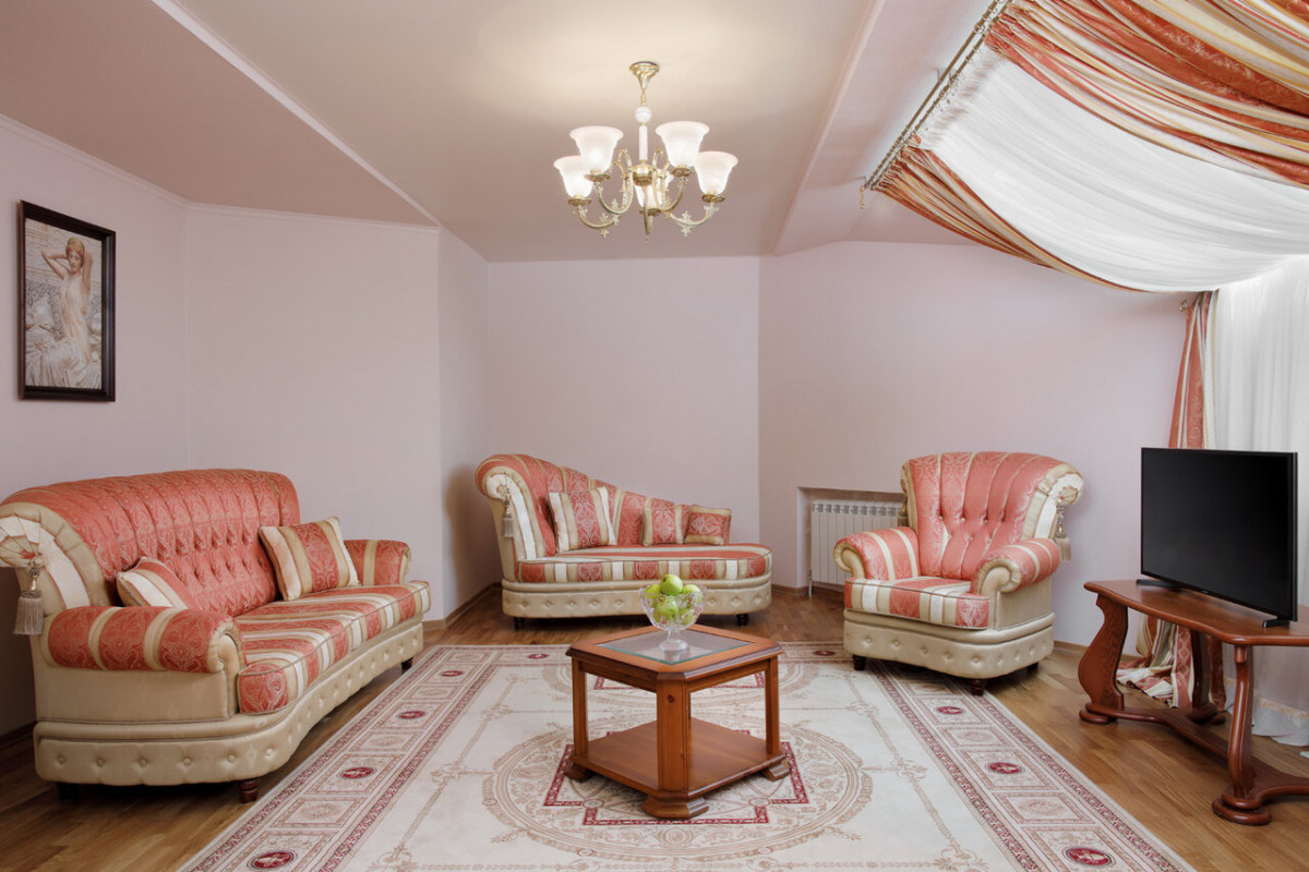 - люкс с балконом — двухкомнатный семейный люкс с балконом, прихожей, гостиной и спальней с двуспальной кроватью. Площадь: 60 кв. м.