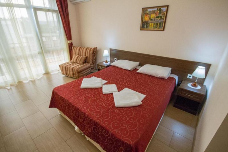 - Полулюкс четырехместный (без балкона) — 21 кв. м, однокомнатный номер на 4 этаже, двуспальная кровать 200х160 и диван 200х160