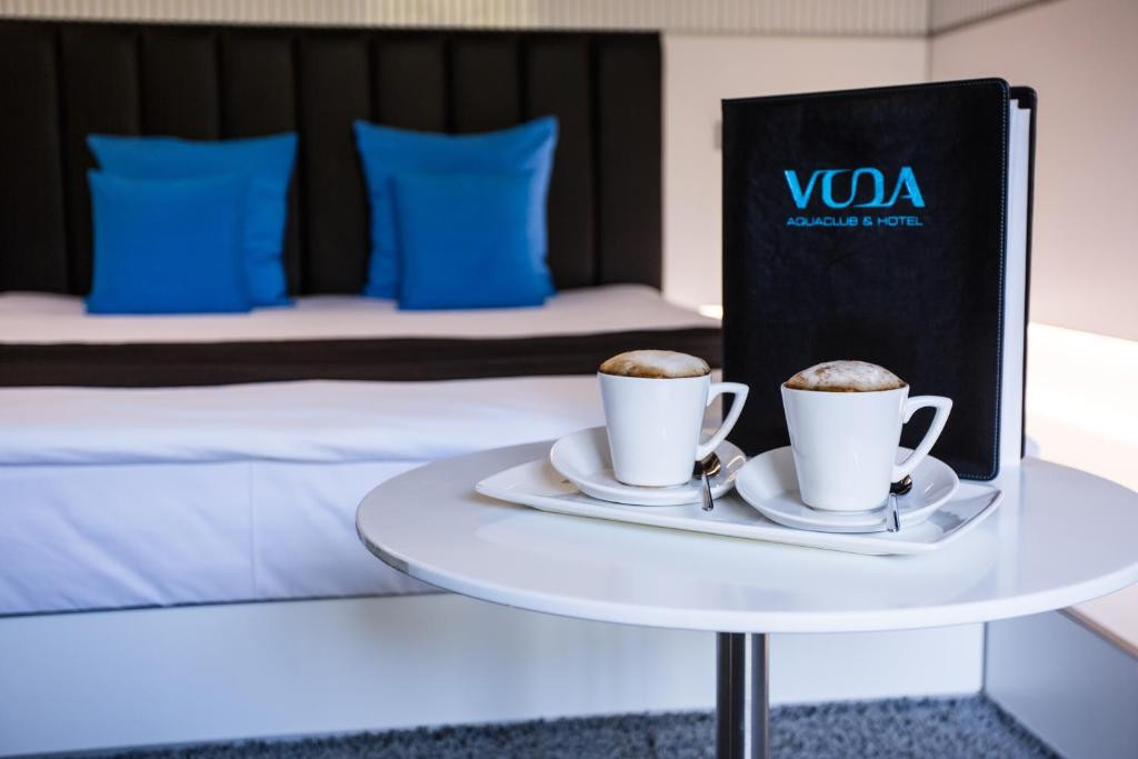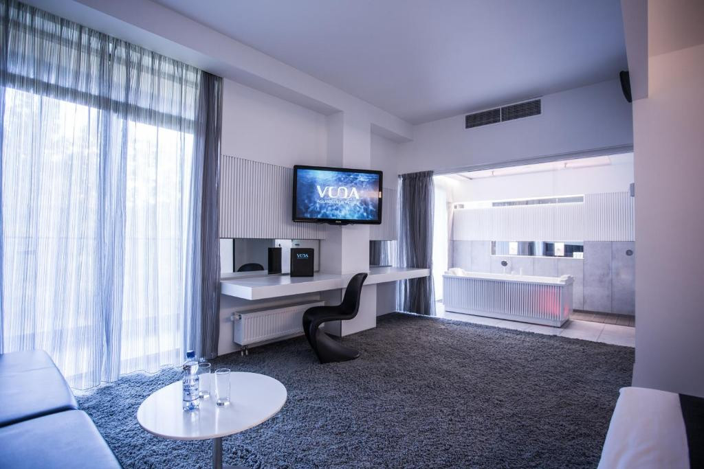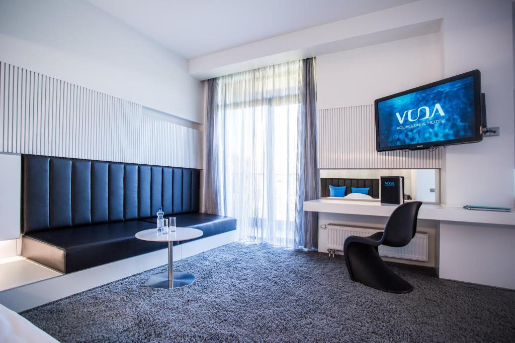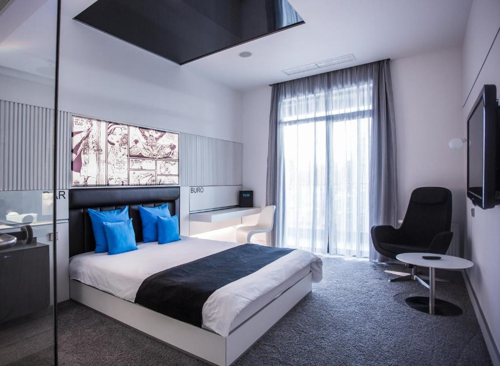 - Делюкс: 28 кв. м, максимально размещение: 2 + 2 гостя. Дизайнерский просторный номер с двуспальной кроватью, кондиционером и телевизором со спутниковыми каналами