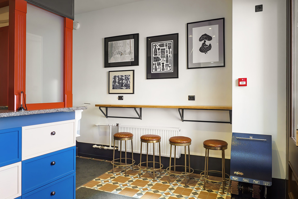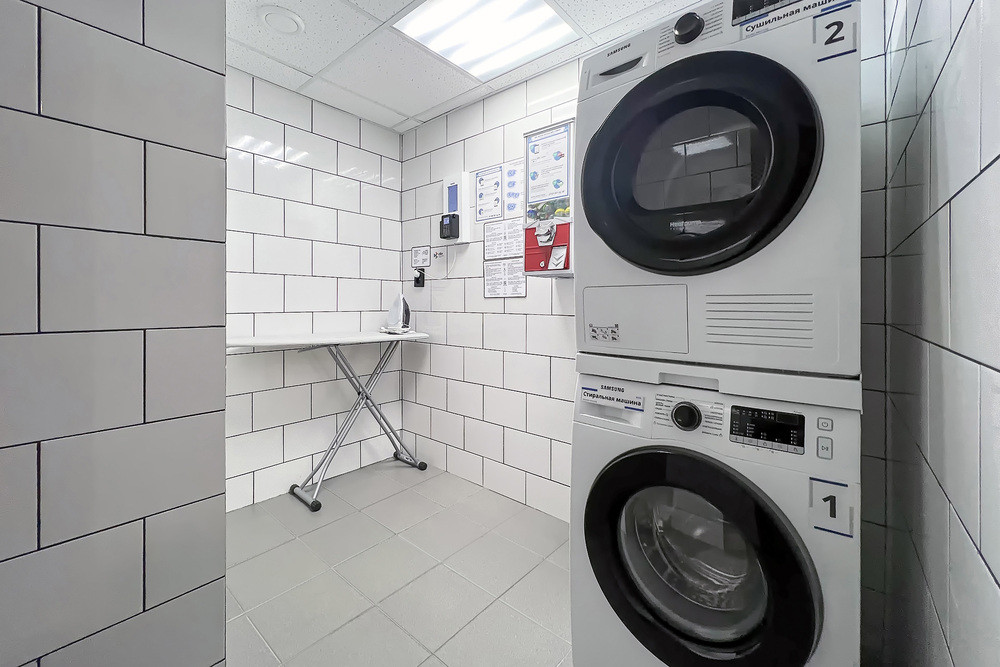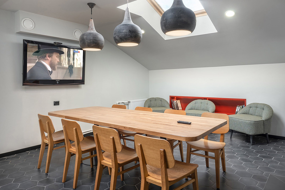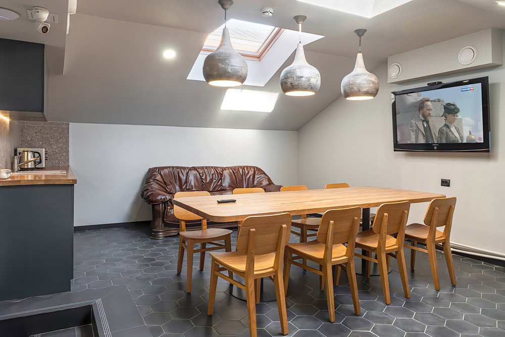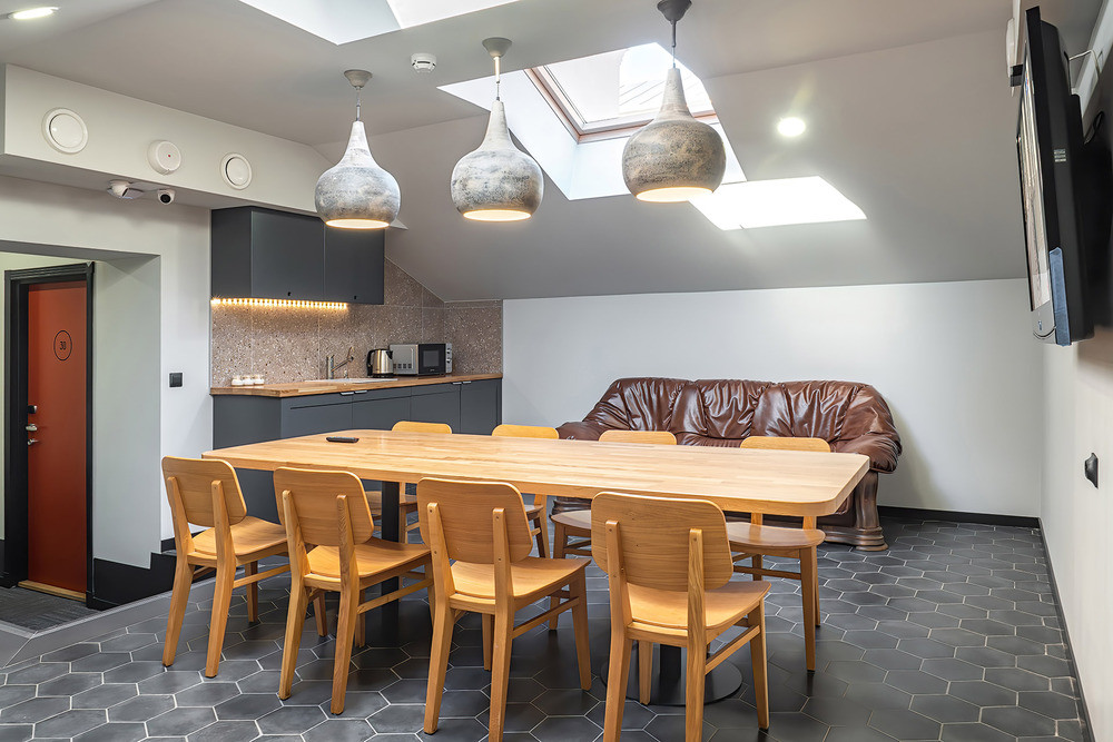 - небольшое общественное пространство: гостиная с общим столом, мягкой зоной, кухонным уголком