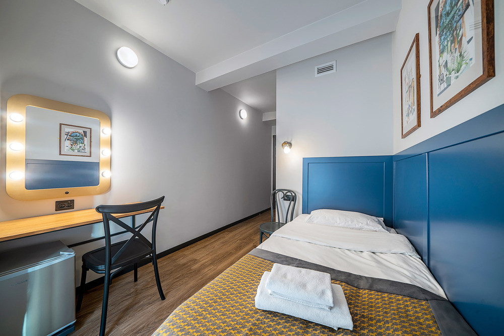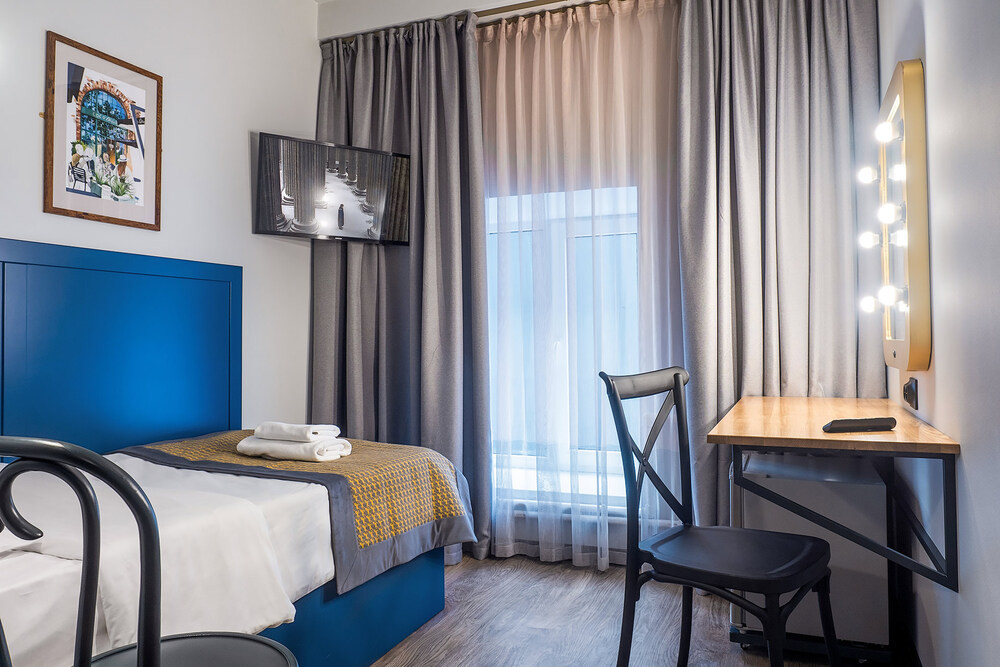 - Стандартный 1-местный 1-комнатный — 9 кв. м, кровать односпальная