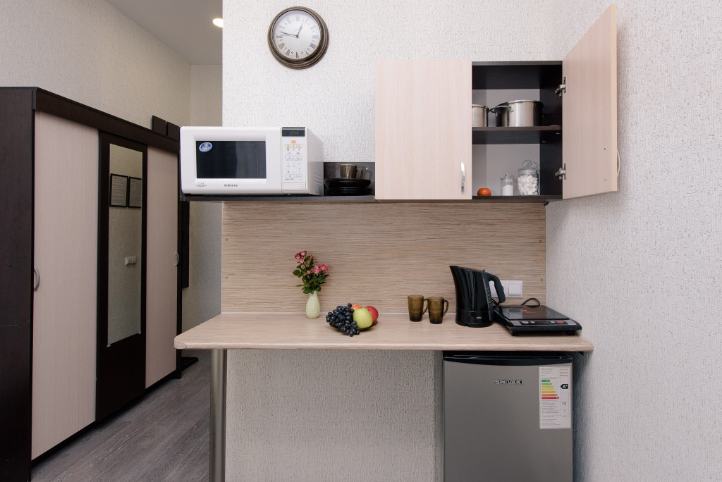 - Эконом 2-местный: 16 кв м, 1-комнатный, 2 осн места, 1 доп место (кресло-кровать), санузел и душевые на этаже