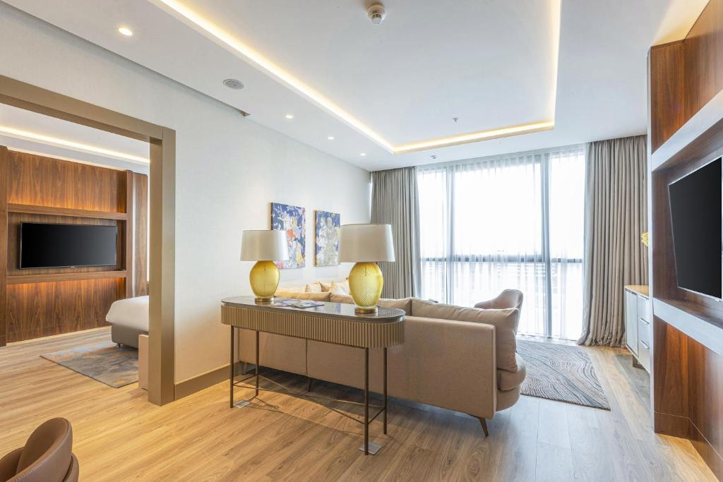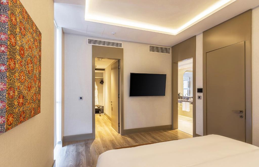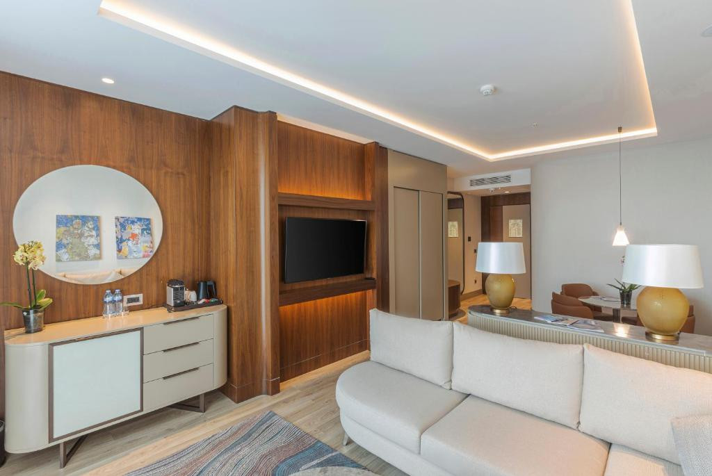 - Suite — 79 кв. м, в двухкомнатном номере с видом на достопримечательности одна двуспальная кровать и диван в гостиной. Число гостей — до 4 человек